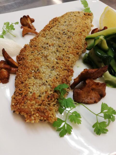 Pike-Perch with Hemp Seeds, Chanterelles and Zucchini