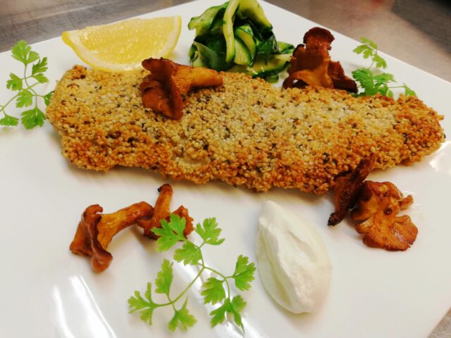 Kuhafilettä hampunsiemenillä, kanttarelleja ja kesäkurpitsaa on herkullinen esimerkki siitä, kuinka kuoritut hampunsiemenet voivat tuoda tuttuihin ruokiin uutta makua ja rakennetta. Hampunsiemenet muodostavat kalan pintaan kauniin, rapean kuoren ja antavat annokseen miellyttävän, pähkinäisen vivahteen.